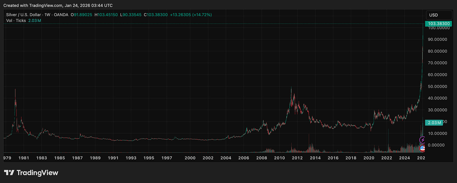 Paper currency is quite a silly thing. It used to be a promise to pay you silver. Then the government broke their promise. Now we just trade this paper back and forth - paper that represents a broken promise. With the rise of silver above $100/oz and gold touching $5000/oz, the question is whether people are starting to realize the paper represents a broken promise.